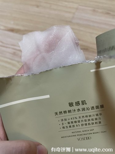 這款養(yǎng)生堂面膜一盒里面是5片裝,面膜拆開(kāi)以后精華液還挺多的,而且膜布很輕薄,上面可以看到一些透氣小孔,敷上以后就挺透氣的,不會(huì)有悶?zāi)樀那闆r出現(xiàn)。