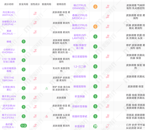 芭貝拉的這款唇膏是由天然植物精粹而成的,里面主要含有蜂蜜復(fù)合油、金紐扣花提取物以及積雪草苷等成分,都是具有滋潤保濕效果的。而且它里面無防腐劑、香精、以及孕婦慎用的風(fēng)險成分,成分溫和度很高,使用起來也比較放心。