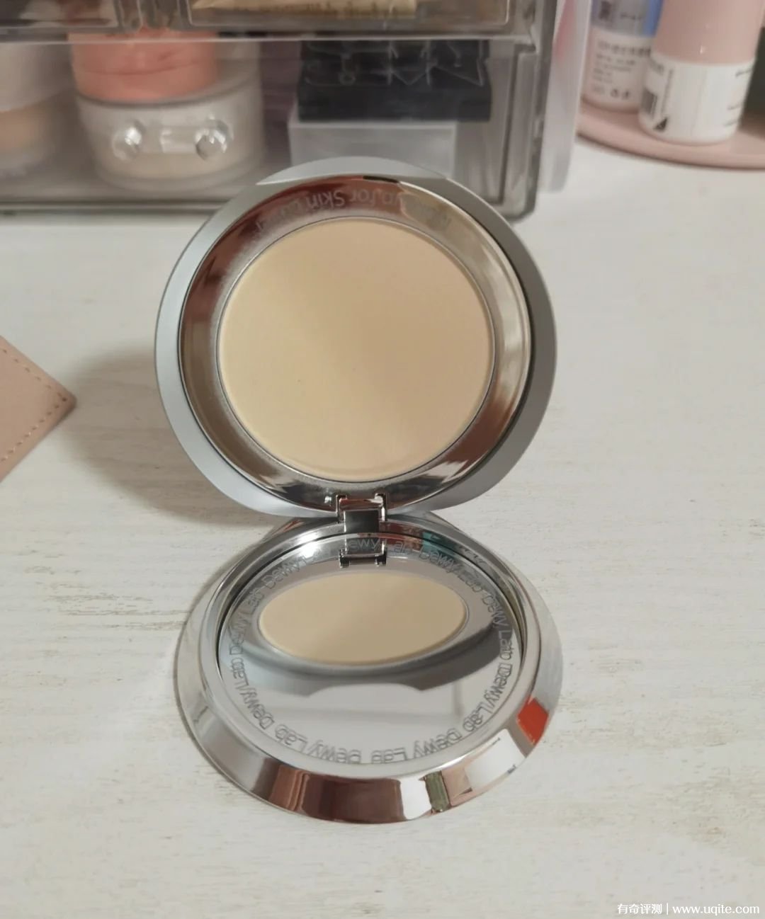 淂意粉餅壓得很嚴(yán)實(shí),不飛粉,粉質(zhì)也細(xì)膩,不過直接上臉妝感要比散粉重,需要和氣墊一樣,先拍掉多余的再上臉。在我看來,它是不適合用來全臉定妝的(用的M01,偏白,可能也有我色號選錯了的原因),補(bǔ)妝更合適。