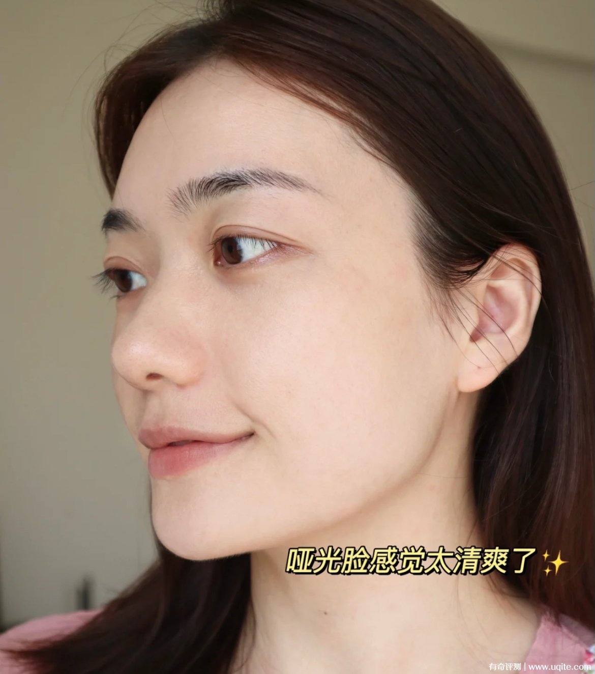 至于乳液,它的質(zhì)地不厚重黏膩,算輕薄的類型,涂在臉上一抹就化水了,它的吸收速度也蠻快的,用完之后皮膚還蠻水潤,有彈性的。它吸收完之后臉上看不見什么油光,有點啞光的感覺,控油效果還是蠻不錯的。