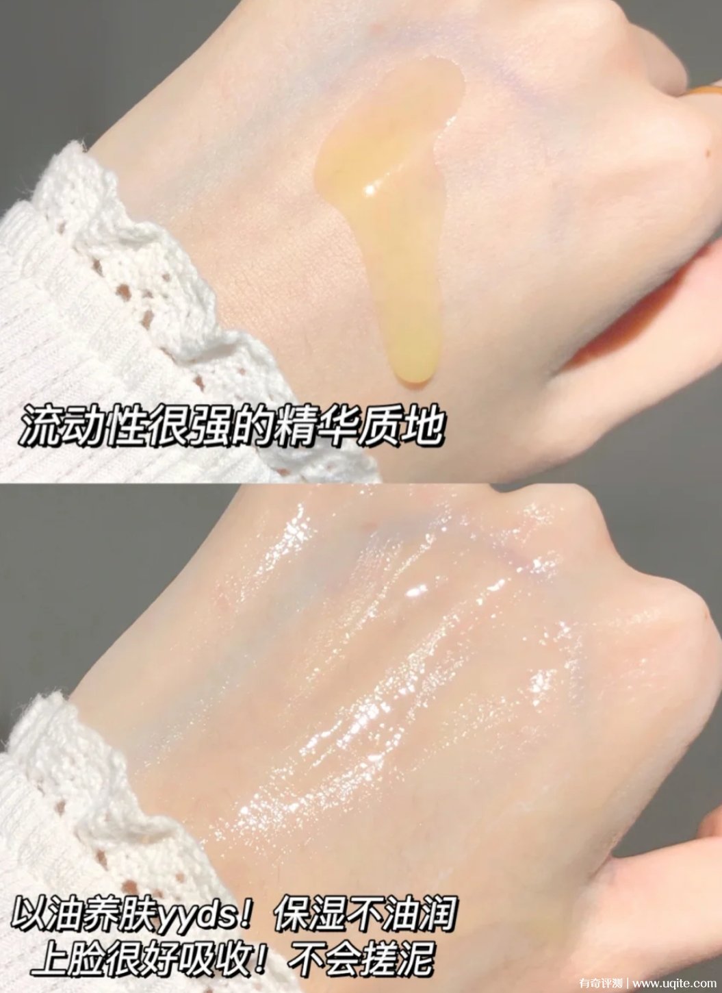 夸迪懸油次拋的流動性還蠻強的,它的質地稍微有點油感,但上臉還行,沒有我想象中的那么油膩,清爽度是有的,用完吸收也不錯,拍拍就完全滲進皮膚里面了。