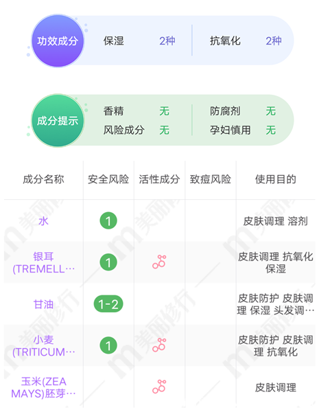 愷普氏面膜打開以后可以聞到一股麥芽香味,而且面膜的精華液很多,上臉敷貼面膜紙很輕薄,一點悶?zāi)樀母杏X都沒有。另外,我查了一下面膜的成分配方,它里面是沒有香精、防腐劑和風險成分的,而且配方簡單,敷貼之后一點不適感都沒有。