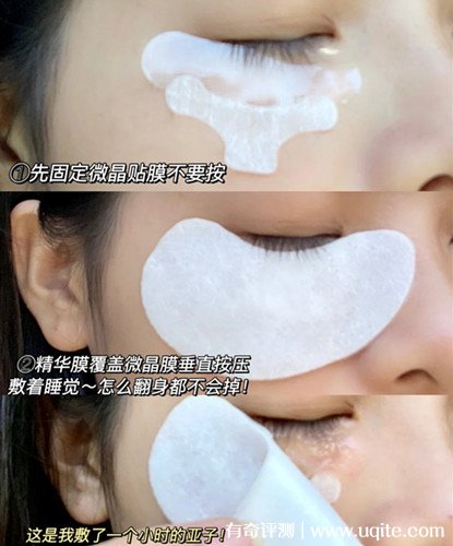 使用時,先將微晶貼膜貼在有細(xì)紋或者是黑眼圈的地方,然后再貼精華膜,讓它覆蓋在微晶體膜上方(輕輕按壓一下,然后固定性挺高的)。這款聽研微晶眼膜在使用時就還挺舒服的,而且我一般都是貼一整晚,然后第二天早上起來揭開眼膜貼底層的微晶貼膜就完全溶解吸收掉了,這時眼部肌膚能感覺明顯水潤了很多。