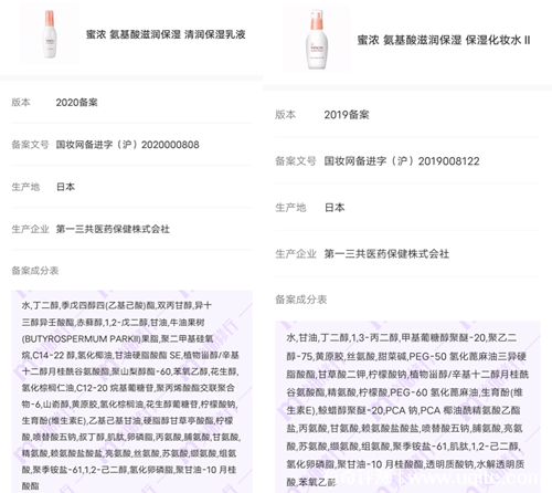 這款蜜濃氨基酸水乳中的化妝水分為一號(hào)款和二好款兩種,其中一號(hào)化妝水質(zhì)地比較清爽,適合春夏季節(jié)和油皮類肌使用;而二號(hào)化妝水質(zhì)地偏滋潤(rùn),比較適合秋冬季節(jié)和干皮類肌膚使用,這個(gè)大家可以根據(jù)自己的膚質(zhì)情況入手。