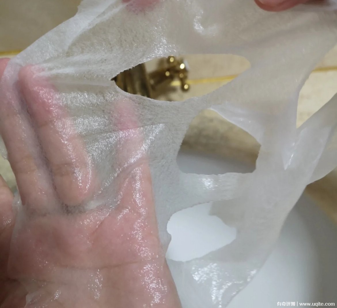 女王傳奇面膜的膜布很薄,它是蠶絲的材質(zhì),上臉親膚,透氣性強(qiáng),不悶,剪裁大小都合適,使用感不錯(cuò)。使用的時(shí)候能感覺精華慢慢進(jìn)入皮膚里面了,里面精華不算很多,精華都在面膜上,精華的質(zhì)地也不黏膩。