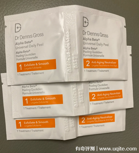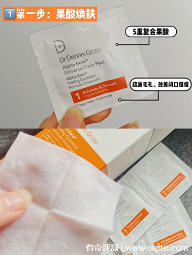 我買的這款丹尼斯醫(yī)生煥膚棉片是通用版的,然后它一盒里面是30片裝,并且每一片又分為一二兩個步驟使用其中步驟一為調理,里面含有5重果酸成分,對疏通毛孔有不錯效果;步驟二為修護,里面含有視黃醇、VC、白藜蘆醇和Q10成分,能夠維穩(wěn)緊實肌膚以及提亮膚色。