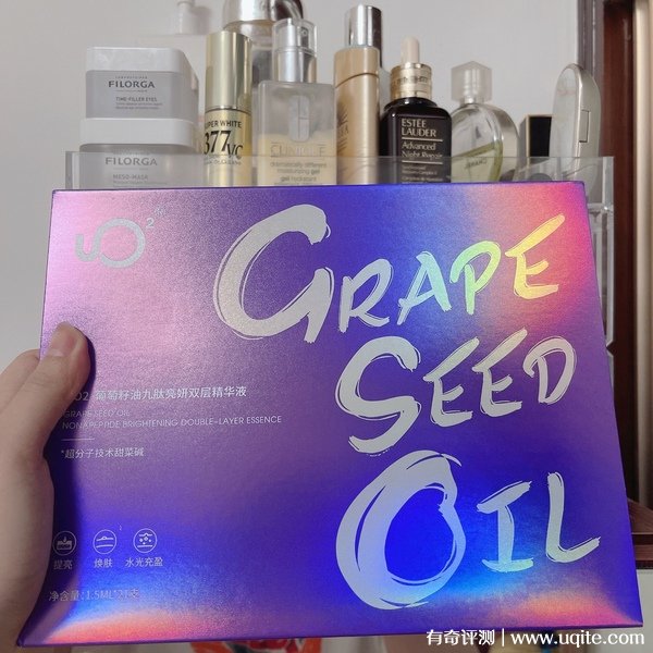 UO2這個牌子的搖搖瓶我是在抖音上看到有博主推薦種草的,當時主要是覺得很好玩,然后里面有油,覺得油更保濕嫩膚,就買了盒試試。我主要是皮膚有些暗沉,買的葡萄籽那款。