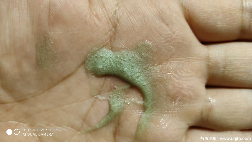 泵出適量杰威爾洗面奶至掌心,可見膏體呈現(xiàn)淡淡的綠色糊狀,有細小的泡泡。膏體聞起來有一股淡雅的海底泥清香,個人感覺有點點像是抹茶的味道。