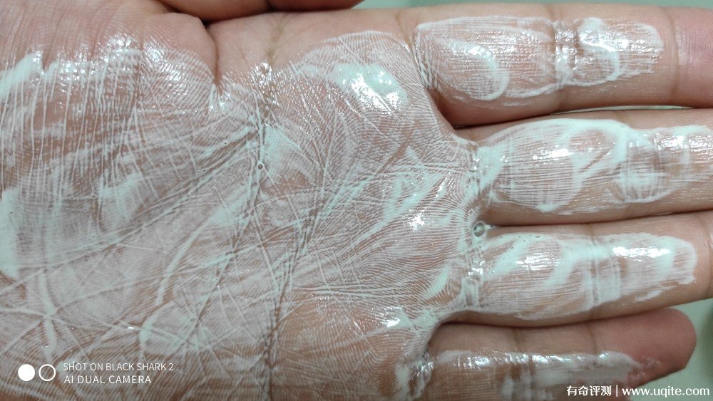 雙手掌心將潔面乳劃小圈揉擦至稍稍起泡,目測泡沫量適中,這時潔面乳呈乳白色,感覺有細細的顆粒磨砂均勻地存于手掌。