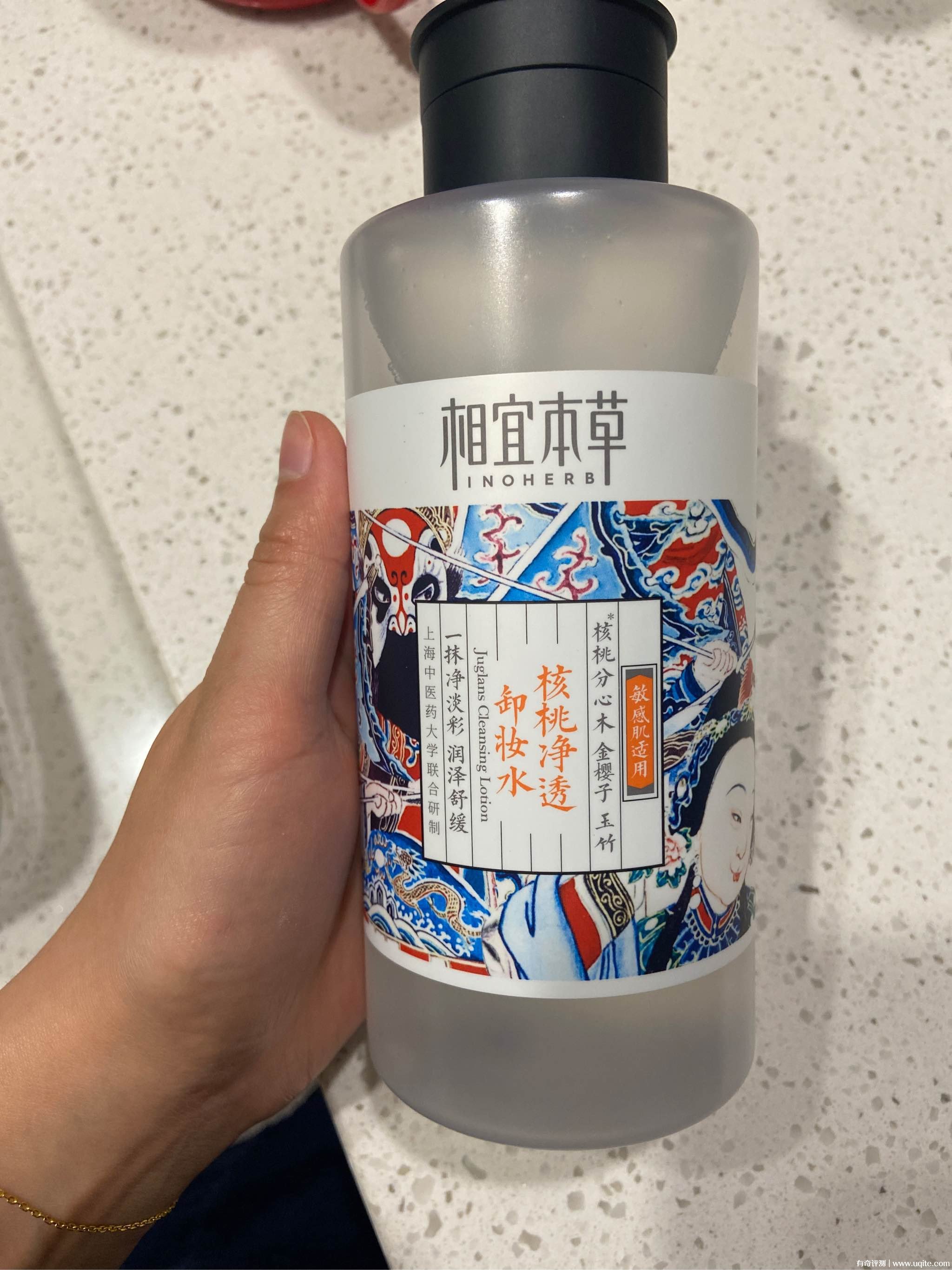 這款相宜本草卸妝水是磨砂質(zhì)感的蓋子,手感爽的不行了!蓋子上有核桃圖形~這應(yīng)該就是他們主打的核桃分心木。