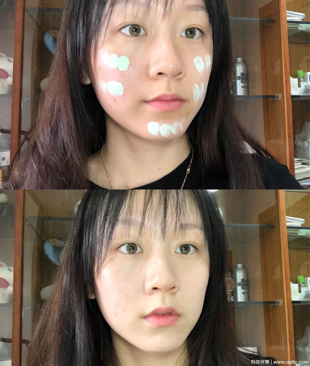 我是混油皮,選的綠色,質(zhì)地還挺潤的,上臉輕輕松松就能推開,而且不悶痘,是清爽的感覺。它的遮暇效果還不錯,黑眼圈都能蓋住一些,整體看著還挺自然,膚色均勻,有磨皮的視覺效果,我每次按一兩下就夠全臉了。大家注意不要用太厚,這可能是韓國牌子的原因吧,韓國人妝感挺重,所以這個涂厚了也會假白。當然,如果單純拿它當妝前乳,當我沒說。