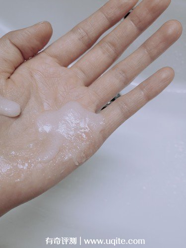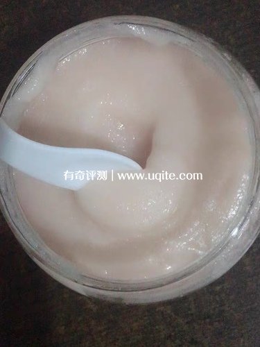 它的質地真的很順滑的感覺(視覺上),特別像水果酸奶,摸著綿綿的潤潤的,磨砂顆粒是我用過的磨砂膏里面最細的了,抹在身上超級細膩。