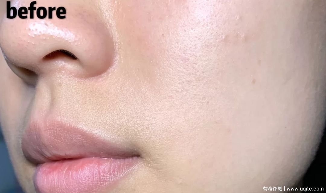 它剛上臉的時候稍稍有點假白,過個半小時之后會自然不少,妝感是偏奶油肌的感覺。我臉上瑕疵不算多,主要是t區(qū)毛孔比較粗大,再加一些小疙瘩,它基本能隱形,遮暇效果個人感覺已經(jīng)不錯了。