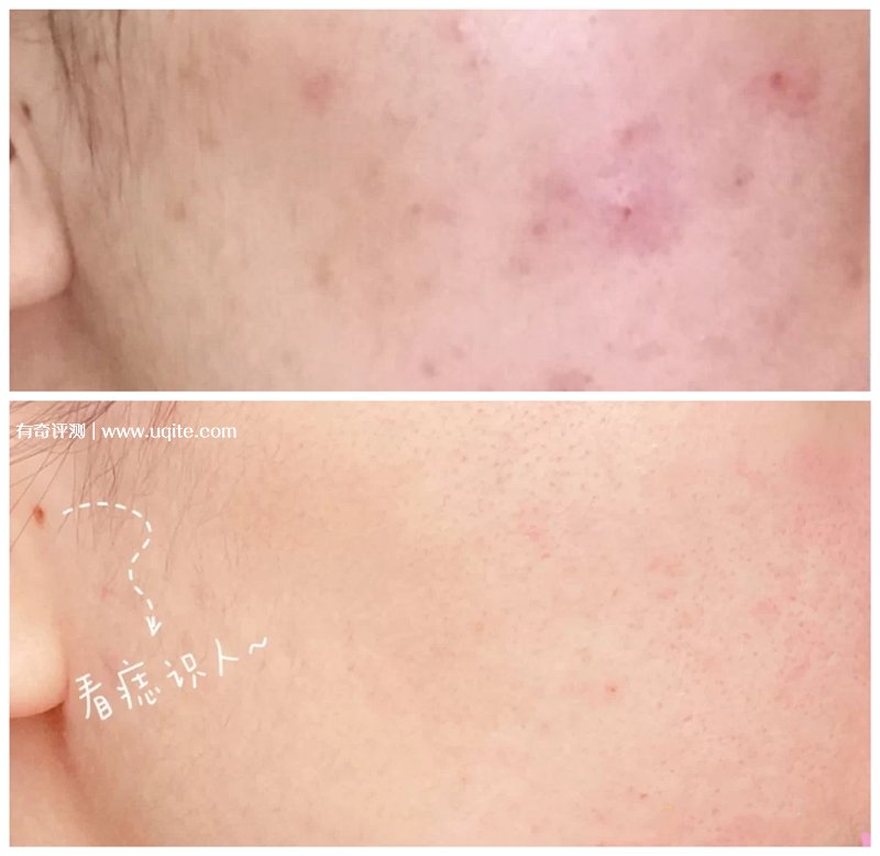 目前我用了一個月左右,效果還挺明顯的,痘痘基本消了,而且痘印也不重了,隔遠一點都看不出,整體看起來皮膚都感覺變好了。