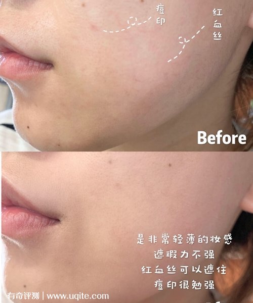 這個(gè)顏色本身跟我膚質(zhì)很搭,我平時(shí)有點(diǎn)暗啞,這個(gè)正好調(diào)整我的氣色,整體很水潤(rùn),唯一可能是遮瑕力不夠足,淺一點(diǎn)的紅血絲是可以遮住,深一點(diǎn)的痘印得用到遮瑕膏。
