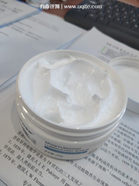 剛打開蓋子,撲鼻而來的就是一陣奶香,我真的是愛了,忍不住要多聞幾下,然后它的質(zhì)地是那種棉花糖的感覺,軟軟糯糯的,非常好推開,磨砂顆粒也不像其他的那么大,太大的顆粒很難推開,也很難洗干凈,這個顆粒是那種細(xì)細(xì)的,很好推開,用在皮膚上也不會有刺痛的感覺。