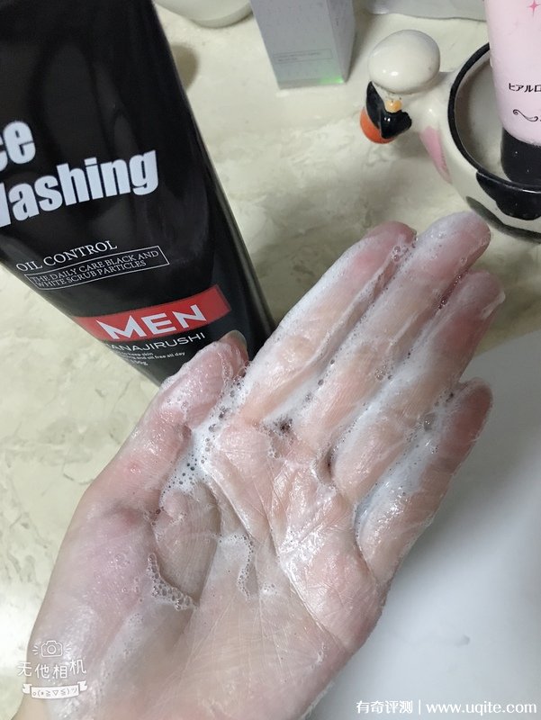 花印這款洗面奶味道聞起來感覺比女生用的還好聞些,我挺喜歡的,里面是深灰色偏膏體狀的,推開還有磨砂顆粒,不過顆粒挺細小的,用著不疼。它泡沫其實還挺豐富的,是那種綿密的類型,不過手打不太行,主要水太少了,多放水又不太好操作,得用起泡網(wǎng)輔助。上臉滑滑的,有種很細膩的感覺,溫和不刺激,夾雜著洗面奶的水流進眼睛也沒啥事。