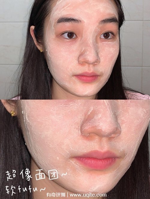 這款面膜打開之后有股面粉發(fā)酵的味道,味道不是很重,也不難聞不刺鼻。它的質地比較的厚實,但上臉之后很好推開,延展性很好,一點也不油膩,我感覺敷完之后臉特別的水潤,補水效果還是很不錯。