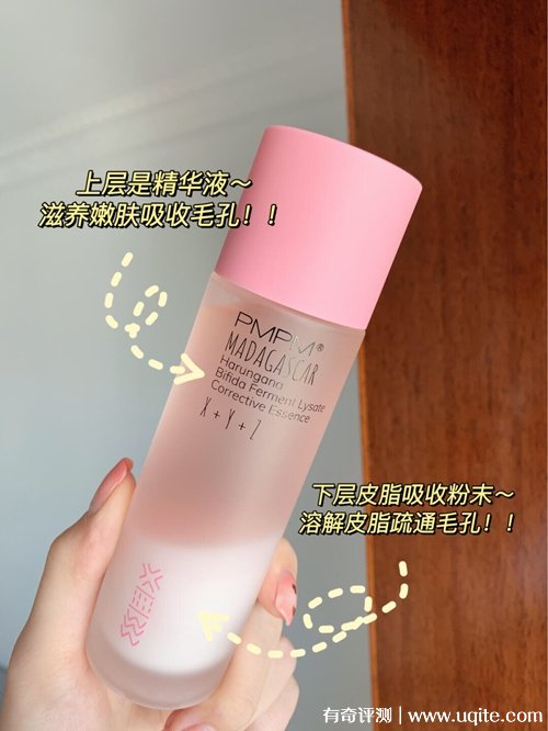 這款粉水拿到手之后我真的覺得它顏值巨高,感覺我都舍不得用,外殼是磨砂的,看著很有質感,而且它還是分層的,上層是精華液,下層是粉末(用的時候需要搖勻),整體看起來粉粉嫩嫩,看著就讓人很有購買欲。