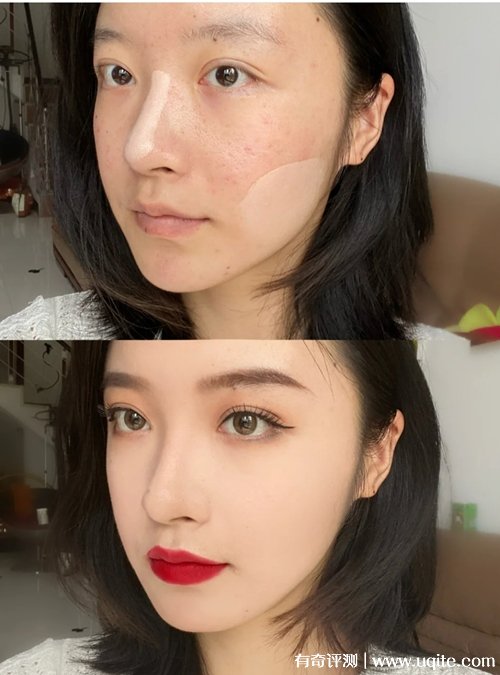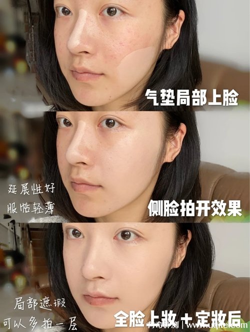 上完氣墊之后臉上的毛孔都隱形了,粉質很細膩,上臉很服帖,不會卡粉假面,跟我的皮膚貼合的很好。它的遮瑕力算是中等偏上的,黑眼圈可以遮個八成左右,臉頰泛紅的地方遮了個九成,對于一款氣墊來說,這個遮瑕程度我很滿意了。