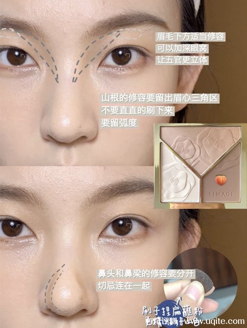 主要修容,簡(jiǎn)直不要太好用,可以修飾眼窩,加深鼻翼輪廓,讓五官在視覺效果上更明顯,掃在下巴處就分分種小v臉,記得邊緣處要暈開哦,不然直直的掃過去會(huì)不自然。