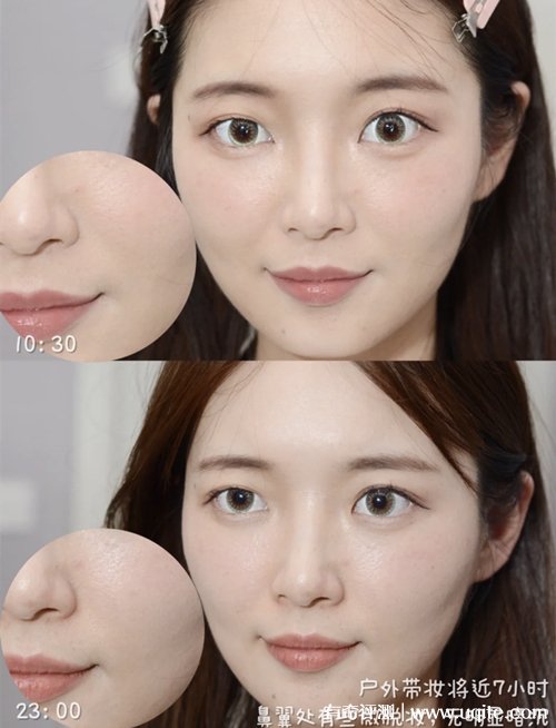 它的遮瑕效果也是很不錯的,我臉上的斑點和痘印基本都被遮住了,連毛孔也隱形了。持妝效果我不錯的,出門一整天妝面保持的還是非常完整,沒有大面積的出油和暗沉,到下午只有鼻翼有點出油和輕微的脫妝,不近看是完全看不出來的。