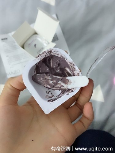 拿到面膜以后我就趕緊用了起來,面膜是深紫色的泥漿質(zhì)地,沒有流動性,但是很滋潤。被看這一小盒面膜不大,但在使用時量還是很多的,足夠一整張臉的使用,而且臉小的朋友,還可能抹不完,得厚敷一些。