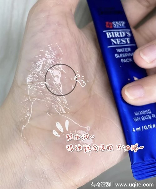 SNP燕窩睡眠面膜的質(zhì)地就像啫喱的質(zhì)地一樣,挺輕薄的,延展性很好,涂在臉上很好推開,不會覺得黏膩,而且吸收速度比較快,不會在臉上一直黏黏的,就是涂它睡覺也不用擔心會粘在枕頭上。因為它是睡眠面膜,我一般用完就沒有洗,如果是油皮的話,吸收完了洗掉剩余的也可以,效果不影響。