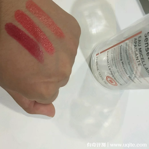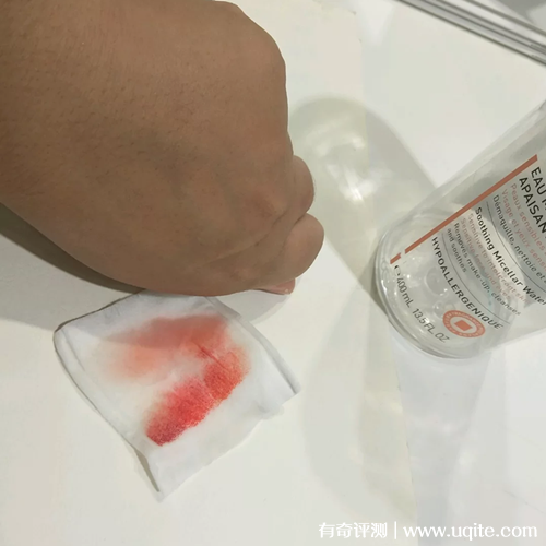 卸妝水的分量很足,包裝顏值也很在線是我喜歡的風(fēng)格,卸妝水是透明的水狀質(zhì)地,聞起來沒有味道。我拿到卸妝水之后就趕緊在手上使用了起來,我直接找了顏色很亮的三色眼影涂在手上,然后用卸妝巾蘸取一些卸妝水,在手部輕敷5秒,然后一擦就沒有了,效果真的很明顯。