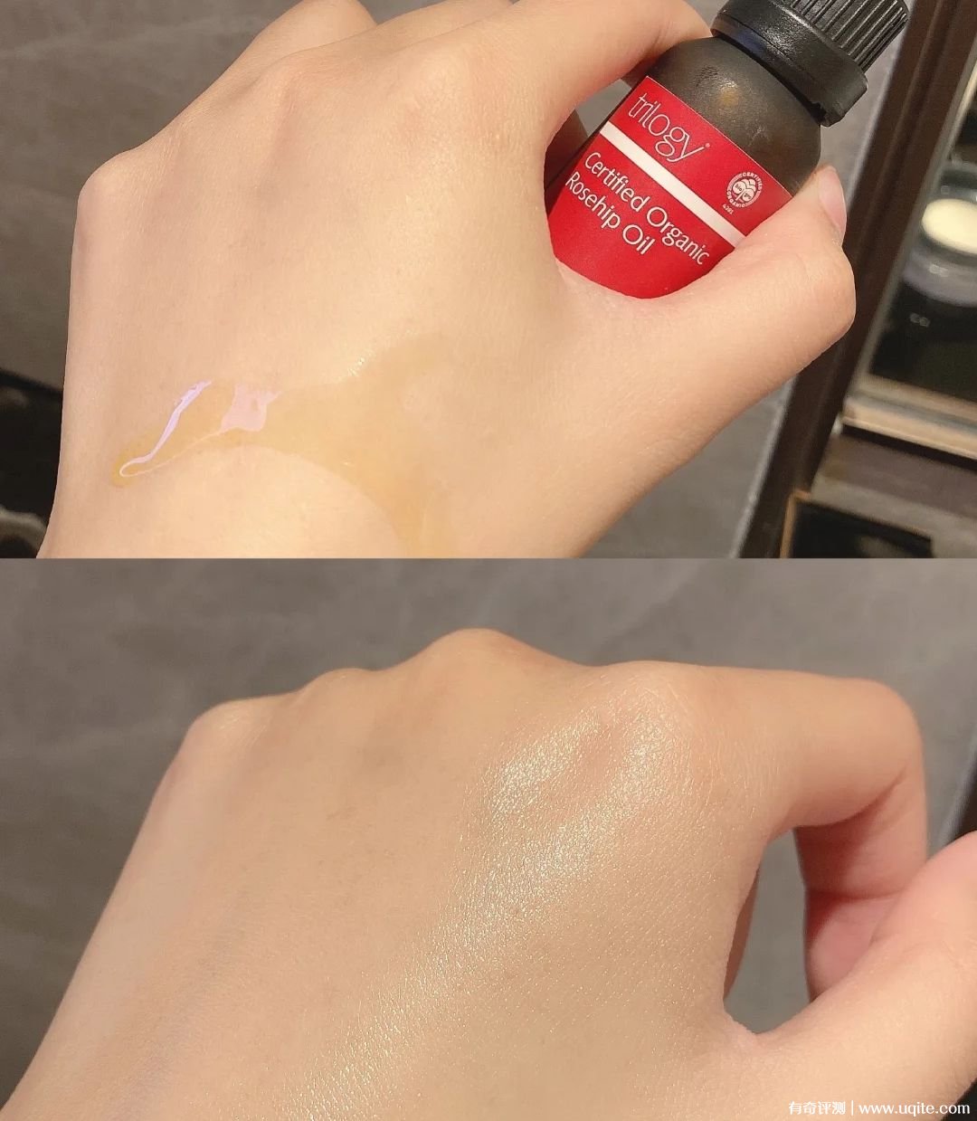 trilogy玫瑰果油味道有點奇怪,不是平時那種玫瑰香,有點像菜籽油的感覺,天然倒是感覺挺天然的。精油質地稍稍有點厚重,需要按摩按摩,對我這個干皮來說倒還好,油皮可能不太適合。用完后皮膚很有水分感,而且第二天醒來皮膚有種水嫩并且略微透亮了的感覺。我用的是詳情頁面推薦的“三明治法”(水—油—精華水)。