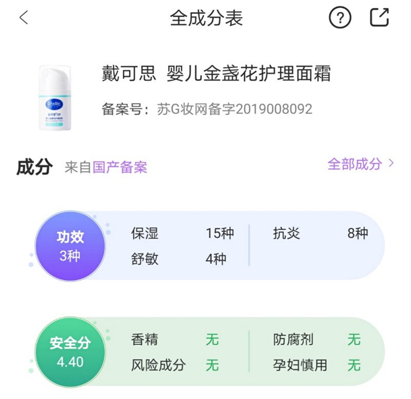 戴可思是國產(chǎn)專業(yè)嬰童護(hù)膚品牌,產(chǎn)品采用優(yōu)質(zhì)原材料,不添加任何對寶寶肌膚造成負(fù)擔(dān)的成分,例如酒精、防腐劑等,致力于為中國寶寶提供自然、安全、有效的專業(yè)肌膚護(hù)理,憑借著高品質(zhì)獲得了無數(shù)寶媽的喜愛。其中,金盞花面霜就是熱賣產(chǎn)品,分為護(hù)理霜和特潤霜兩款,均屬于妝字號產(chǎn)品,而非消字號(消字號產(chǎn)品成分并非完全公開,激素屬于量小但效果猛的產(chǎn)品,可以不進(jìn)行標(biāo)注,因此大家謹(jǐn)慎購買),產(chǎn)品成分安全,不含激素、防腐劑等成分。下面一起來具體看看戴可思金盞花嬰兒面霜怎么樣吧。