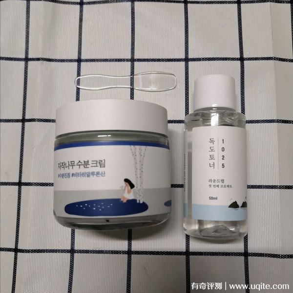 獨島面霜實物外包裝看著蠻清新的感覺,味道聞著也很舒服,到手的時候還送了一個勺子和他們家的護膚水小樣,護膚水暫時還沒用,勺子用著挺方便的,也衛(wèi)生。