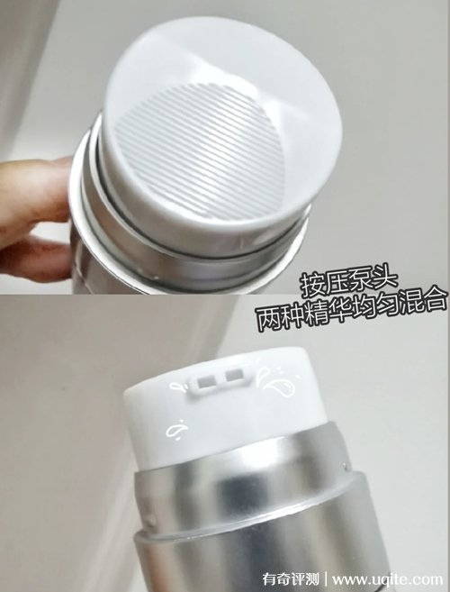 這款精華是一個(gè)雙管精華,擠一泵會(huì)出現(xiàn)兩種精華,用之前需要將兩種精華混合再涂抹上臉,它雖然是精華,但它的質(zhì)地有點(diǎn)偏乳液的質(zhì)地,涂在臉上不會(huì)覺(jué)得很黏膩,還挺清爽的,吸收速度也挺快的,稍微拍打幾下就全部吸收了,吸收完之后皮膚摸著還挺水潤(rùn)的。