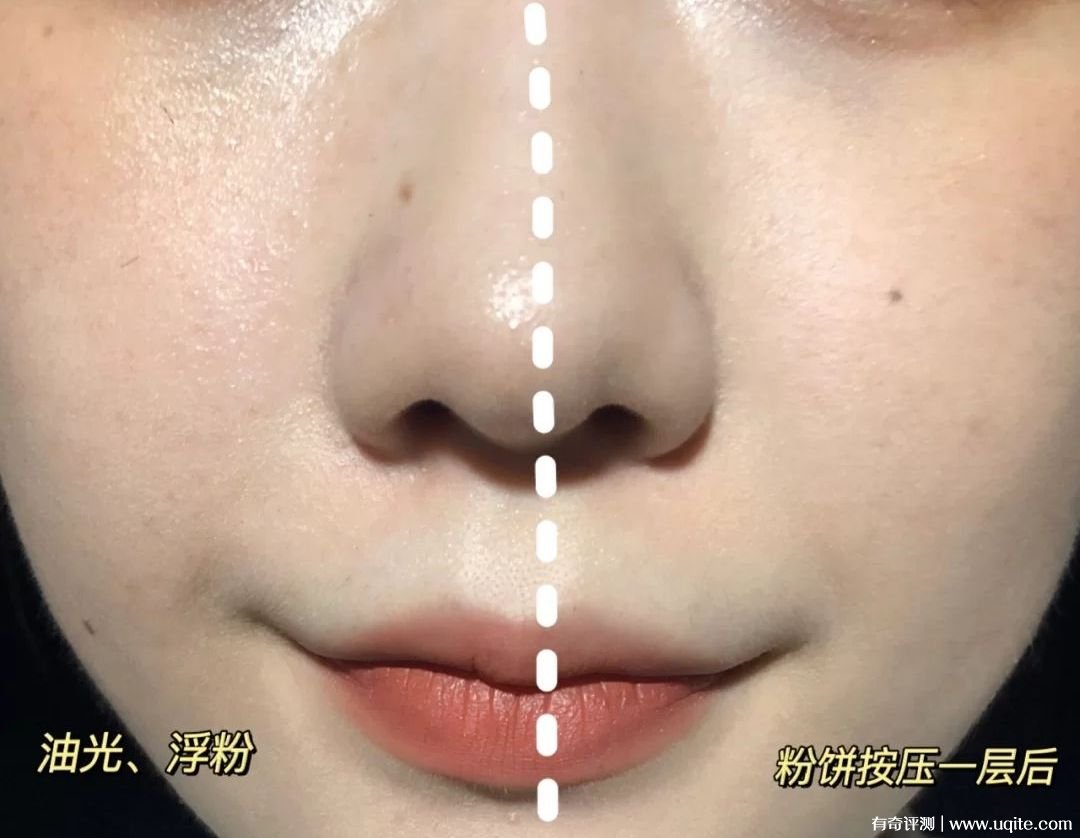 我選的是自然色,上臉確實還挺自然的,不假白,按壓一層之后油光瞬間消失,還有隱形毛孔的效果??赜头矫娌诲e,像我平時一般出門兩三個小時就會有點油光了,這個用著,出門六個小時左右,鼻子才會冒出一點油光,影響不大。