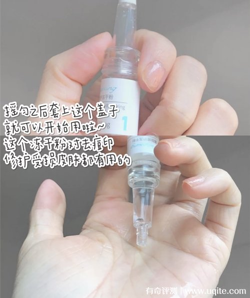 它使用起來也很簡單,首先將溶媒液倒入凍干粉中,然后蓋上蓋帽搖勻,取下頂端蓋就可以使用了,一對凍干粉差不多可以用個三四次,我主要是涂在痘印和閉口嚴重的地方(凍干粉每次剩下的要放在冰箱里儲藏,而且要在3天內(nèi)用完)