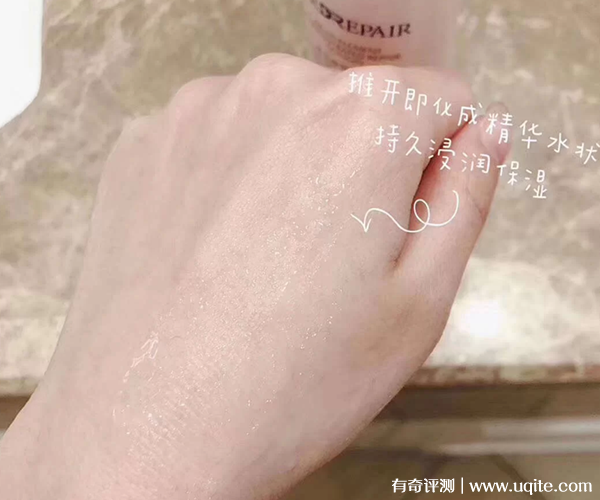 產(chǎn)品雖然叫粉水,但它的質(zhì)地卻水乳狀的,蛋清的質(zhì)地,有一定的粘稠性,但是流動(dòng)性還不錯(cuò)。粉水是按壓式的設(shè)計(jì)頭,在使用時(shí)可以很好的掌握使用量,上手推開一秒化水,保濕效果很不錯(cuò)。