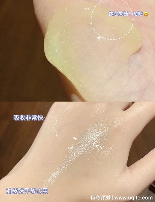 HBN面膜的質(zhì)地有點(diǎn)像啫喱,顏色是淡黃色,里面還有一些小凝珠顆粒,上臉冰冰涼涼的,是那種不會(huì)干的類型,而且還特別潤,這款面膜我一般都是敷20-30分鐘左右,用的時(shí)間就比較長,差不多敷到十幾分鐘的時(shí)候,就會(huì)發(fā)現(xiàn)它慢慢被吸收了,顏色變透明了。