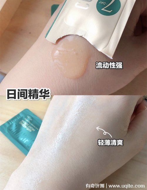 早間精華擠出來(lái)是淡黃色的,有一定的流動(dòng)性,看著挺濃稠的,但上臉很滋潤(rùn),不黏膩,吸收速度也很快,稍微怕打幾下就全部吸收了,早上用完后有很明顯提亮膚色的效果,而且用完它之后化妝,一整天下來(lái)底妝也不會(huì)暗沉。