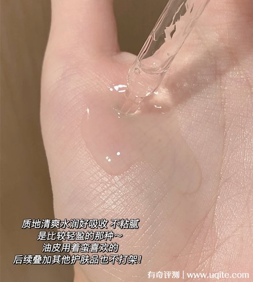 它的滴管的取量方式,用著還是蠻干凈衛(wèi)生的,精華的質(zhì)地挺水潤的,屬于有點粘稠的類型,上臉還比較清爽,不會覺得悶,我一般半泵的量就可以涂全臉了,涂在臉上之后它的吸收還挺快的,隨便怕打幾下就吸收了,用完之后還挺清爽,完全不會黏膩,精華全部被皮膚吸收了。