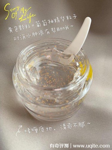 產(chǎn)品的包裝是屬于比較簡(jiǎn)約大氣的那種,透明的瓶子一眼就能看清楚里面的面膜質(zhì)地。面膜是凝膠狀的,看著晶晶亮亮的,而且里面還夾雜著一些金黃的小顆粒,是富含葡萄柚的精華粒子,對(duì)消水腫有很不錯(cuò)的幫助。