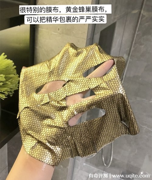 歐枝24K黃金面膜的膜布還挺特殊的,是黃金蜂巢的面膜紙,相比普通的面膜紙,這款設計能夠緊緊的鎖住精華,而且它敷在臉上也超級服帖,完全不會往下掉。