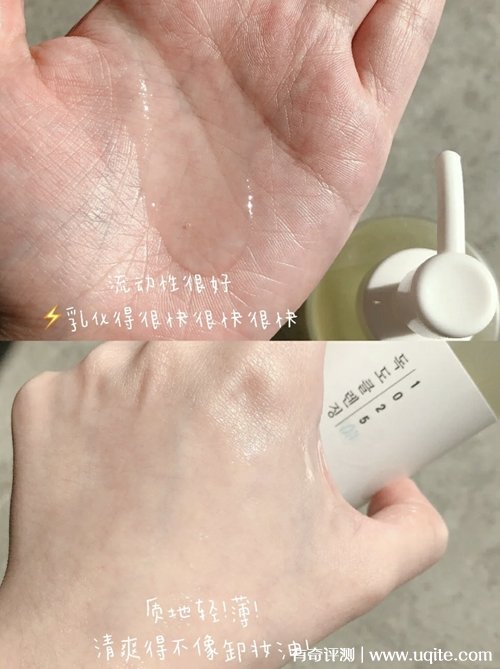 它的卸妝效果還蠻強(qiáng)的,像口紅、眼影、眼線這些化妝品她都可以很輕松的卸下來,內(nèi)眼線卸著也沒壓力,獨(dú)島卸妝油用的時(shí)候是需要乳化,加點(diǎn)水就乳化了,它也挺好沖洗的,用清水沖一沖就可以洗的很干凈,洗完之后也不會覺得悶。