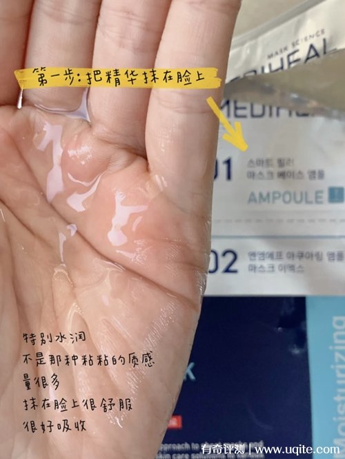 美迪惠爾面膜是分為兩部的,第一步先把面膜上面的精華涂在臉上,然后再敷面膜,它精華的質(zhì)地還蠻水潤的,不黏膩,一抹就化水的感覺,用完之后皮膚確實(shí)水潤了不少。