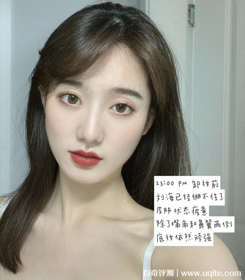 控油效果還挺好的,我本身是一個(gè)油皮,用了之后油光立馬消失,就想開(kāi)了磨皮效果一樣,很自然的啞光妝感,看著還蠻高級(jí)的。它的持妝效果也不錯(cuò),出去逛街一天中途也沒(méi)有補(bǔ)妝,回來(lái)之后發(fā)現(xiàn)妝容基本上沒(méi)有怎么脫,只有鼻翼兩側(cè)會(huì)有微微的脫妝,問(wèn)題不大,看不太出來(lái),整體妝容還是很完整的,抗氧化能力也不錯(cuò),妝容也沒(méi)有怎么暗沉,看著還是非常的透亮。