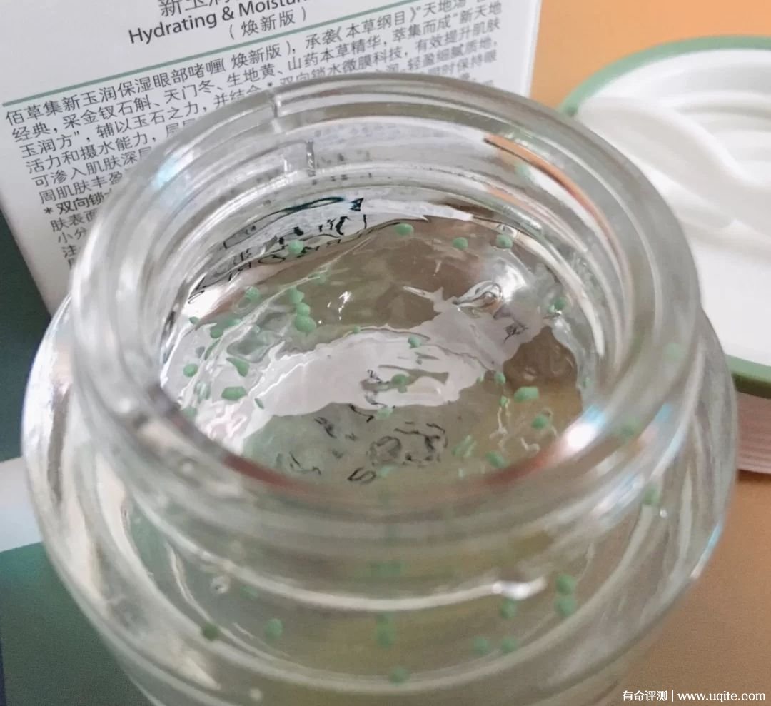 佰草集眼部啫喱味道淡淡的,質(zhì)地很像蘆薈膠的感覺,水潤度很高,每次用一點(diǎn)點(diǎn)就夠了,很耐用。它抹開潤潤的,不粘膩,吸收也還不錯(cuò),里面的綠色顆粒,不是很好化開,我每次都是在掌心先給它揉開了再上臉的。