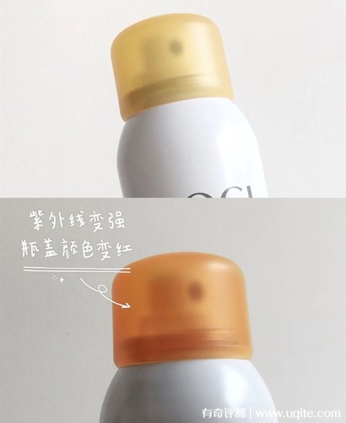 另外,這款高姿防曬噴霧設(shè)計的很有趣的一點是,它的瓶蓋是可以變色的,在紫外線弱的時候,瓶蓋是換個的,紫外線強(qiáng)的時候,它的瓶蓋就會變成紅色,用著還蠻好玩的。