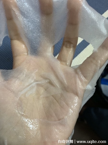 紀束面膜的膜布是很輕薄的類型,上臉服帖,大小剪裁什么的也挺合適,使用感好,不悶。里面精華含量還挺多,拿出膜布之后里面還會有點剩的(它這個膜布本身挺能掛得住精華的),可以抹在其他地方,精華不算粘稠,吸收還不錯,使用過程中能清楚感受到膜布慢慢在變干。