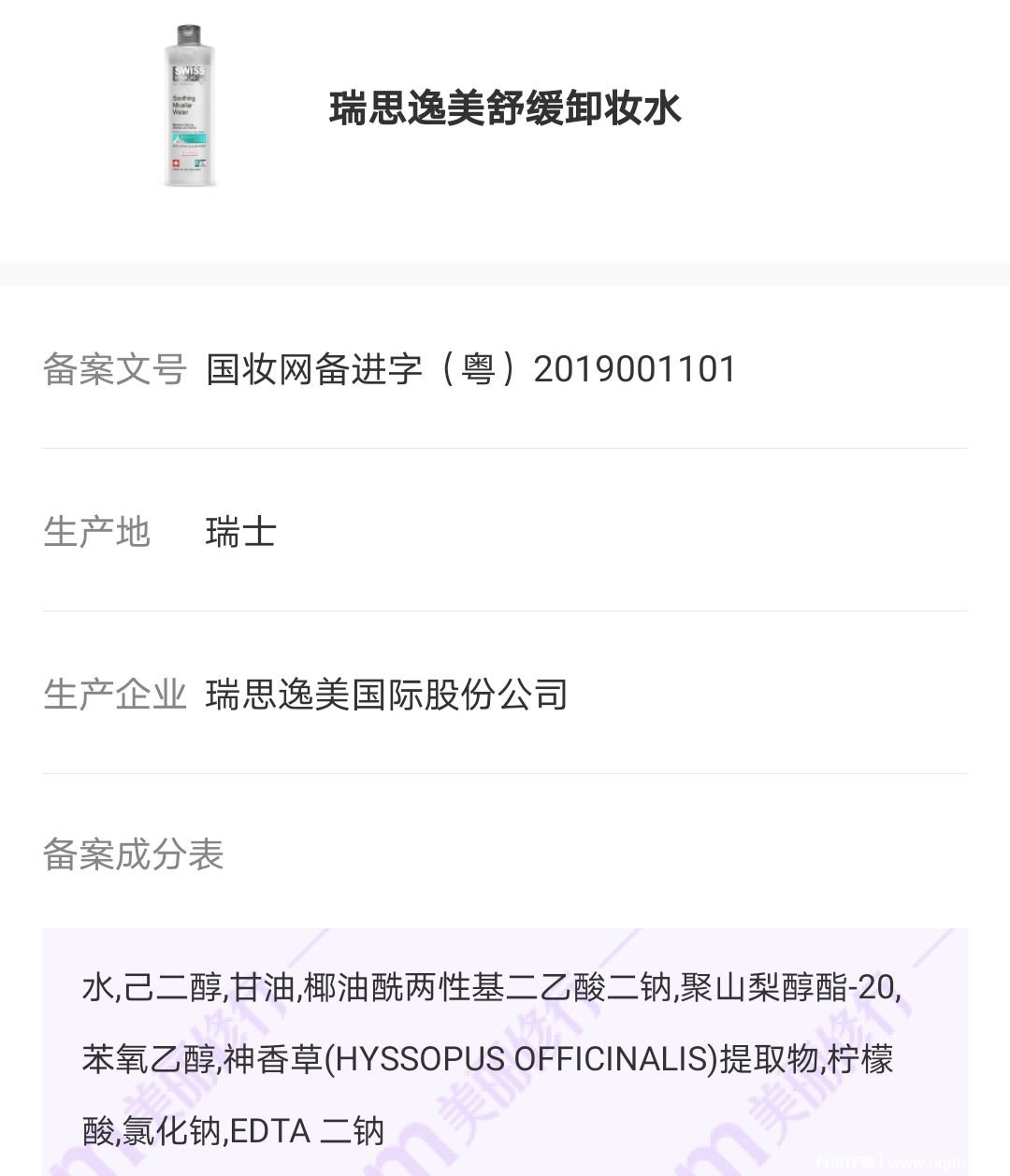 swissimage(瑞思逸美)是一個來自瑞士的化妝品品牌,有50多年歷史了,一直致力于研發(fā)高品質(zhì)、高性價比的護膚產(chǎn)品,全線產(chǎn)品都包含阿爾卑斯冰川融水,溫和安全,受到了許多消費者的喜愛。其中,卸妝水就是一款熱銷產(chǎn)品,不含香精、風險成分以及孕婦慎用成分,安全性高。下面一起來具體看看swissimage卸妝水怎么樣。