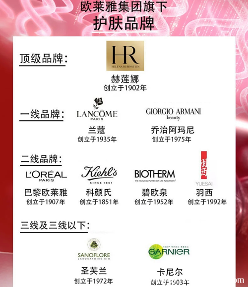歐萊雅(L’ORÉAL)是來自法國的化妝品品牌,也是世界著名的化妝品公司,大家一般說的歐萊雅可能是指巴黎歐萊雅,它是歐雅萊集團(tuán)旗下的一個子品牌,而歐萊雅集團(tuán)旗下一共有28個子品牌,其中包括赫蓮娜、ysl、蘭蔻、阿瑪尼這些一線大牌,產(chǎn)品種類全,涉及面廣,低中高端檔次的都有。