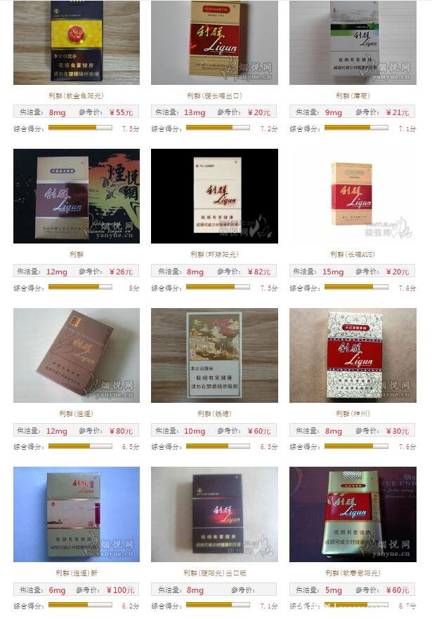 利群是中國知名老字號品牌,由浙江中煙工業(yè)股份有限公司出品,現(xiàn)有利群(喜慶)、利群(軟陽光)、利群(休閑)、利群(陽光)、利群(軟長嘴)、利群(新版)、利群(軟紅長嘴)、利群(神州)、利群(硬)、利群(長嘴)、利群(軟藍(lán))、利群(逍遙)、利群(老版)、利群(長嘴8mg)、利群(軟)、利群(軟陽光出口)、利群(藍(lán)天)、利群(硬長嘴出口)、利群(長嘴AUS)、利群(軟長嘴5mg)、利群(8mg)、利群(硬富春山居)、利群(逍遙)新、利群、利群(神州)新、利群(軟春意陽光)、利群(薄荷)、利群(西子陽光)、利群(休閑云端)、利群(錢塘)、利群(江南憶)、利群(環(huán)球陽光)、利群(西湖戀)、利群(專供浙江地區(qū)版)、利群(國色天香)、利群(軟富春山居)、利群(軟金色陽光)、利群(金色陽光)等產(chǎn)品。